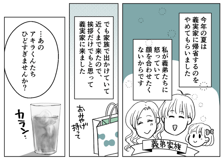 私はルイ(33)。旦那のノブアキ(36)とタイジュ(小2)、ジュン(5)と4人暮らしです。いつも夏は義実家に帰省するのですが、どうしても嫌なことがあって来たくありませんでした。けれど、旦那が顔くらいは出したいというので、手土産を買って向かいました。義実家へ着くとちょうど出かける様子だったのですが、どうやら義妹のメグミさんと子どもたちは一緒に行かない様子で……? 思わず声をかけました。
