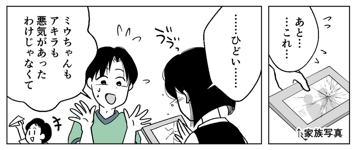 さらに、旦那から気まずそうに見せられたのは、割れた写真立て。せっかく家族写真を飾っていたのに……思わず涙が出てきました。