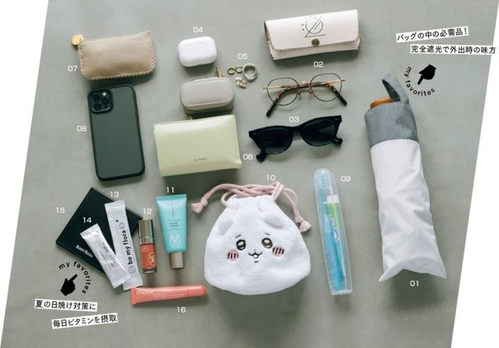 01開閉も簡単でコンパクトな日傘「サンバリア100」は、持っているだけで安心。02反射せずにどんなスタイルにもさらっとなじんでくれるリシーのメガネ。03オリバーピープルズのサングラスは長く愛用したいと思えるベーシックなフォルムを選択。04AirPodsではお気に入りのK-POPを。05撮影時や旅行の際にアクセサリーをなくさないようにケースにIN。ピアスはヒロタカ、マリア ブラック。06ジル サンダーの財布は3年ほど愛用中。ソフトなグリーンが可愛くて気に入ってます。07ステラ マッカートニーのキーケースはジップ付きが使い勝手抜群。08クリアケースにステッカーやカードを入れてデコるのも憧れますが……(笑)。シンプル一択。09食後の習慣になっています。10ちいかわのポーチには日常的に使う小物をIN。汚れないように大切に使っています。11モロッカンオイルのハンドクリームは香りが好き過ぎます。12偏光パールがたっぷり入ったクラランスのリップコンフォートオイル。13腸活のため毎日欠かさず。14高濃度ビタミンCのサプリ。15サイズ感が便利な鏡。16ロードのリップティントは保湿しつつほのかに色づきます。