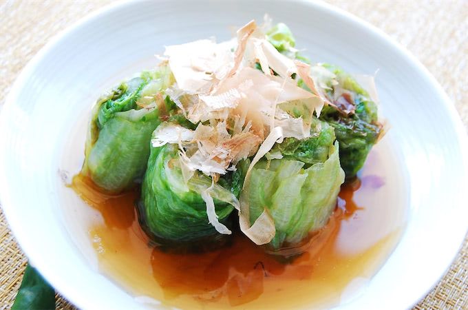 レタスは“生食でなく加熱がうまい“とは、目からウロコ。生のレタスをシャクシャク食べるのが、一番おいしいのかと思っていました。けれど、YouTubeチャンネル『料理教室のBonちゃん』によると加熱する方が、生で食べるよりおいしいのだそう。そこで、Bonちゃんおすすめの「レタスの1番おいしい食べ方」を試してみることに。サッと茹でたレタスを重ねてクルクル巻き、市販のめんつゆをかけていただくそうですよ。