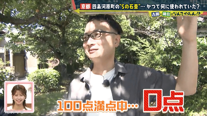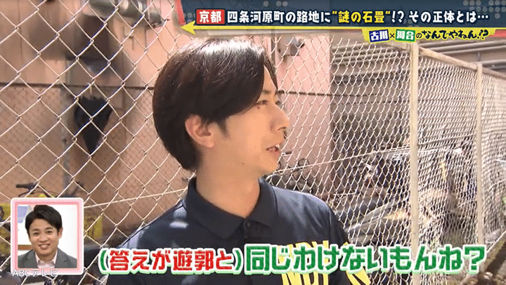 石畳といえば、2025年4月に河合と古川アナが大阪で調査した、日本三大遊郭の1つ「新町遊郭」の名残が記憶に新しい。そのため2人は、「なんかもう遊郭のイメージしかない」「ヤバイ。でもそっちに引っ張られちゃうよね。だってそっち(前回の答え)と同じわけないもんね」「本当にわけない?」「え、一緒!?」などと、この京都の石畳も遊郭の名残かもしれないと半信半疑ながら考えた。