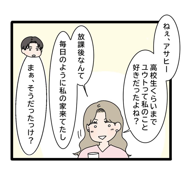 何を言い出すかと思ったら、「ねぇ、アサヒ―。高校生くらいまでユウトって私のこと好きだったよね?放課後なんて、毎日のように私の家来てたし。」と、隣にいる私に聞こえよがしに、自分の夫であるアサヒさんにそんな話題を振ったのです。アサヒさんは肯定も否定もせず「まぁ、そうだったっけ?」と曖昧な返事。