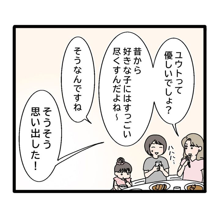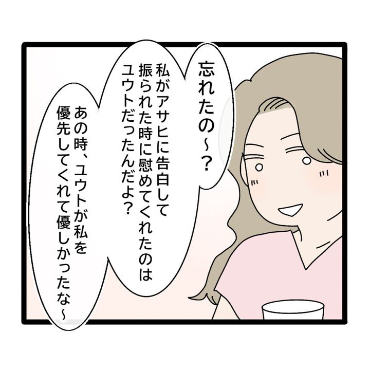 ユキさんは「忘れたの~?」といっそう声を大きくしてスルーしようとしたアサヒさんに畳みかけました。「私がアサヒに告白してフラれた時に慰めてくれたのはユウトだったんだよ?あの時、ユウトが私を優先してくれて優しかったな~。」