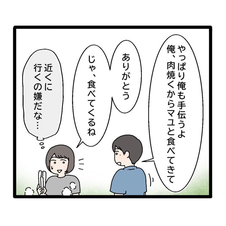 義兄家族と一緒に参加していたBBQ。みんなが先に食べている間、肉を焼いていた私の所へ「やっぱり俺も手伝うよ。俺、肉焼くからマユと食べてきて。」とユウトが戻ってきてくれました。本当のことを言うと、ユキさんがいるところにあまり近づきたくなかったから、ここで肉を焼いているのはそれほど苦痛じゃなかったんだけどな。でも交代に来てくれたユウトに「ありがとう。じゃ、食べてくるね」と言ってテーブルへ行きました。ユウトの席、ユキさんの隣なんだよなぁ。