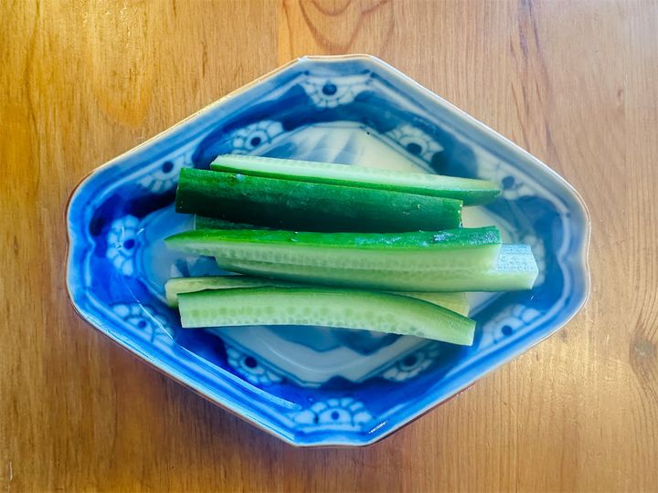 きゅうりは半分長さに切り、さらに縦4等分にします。