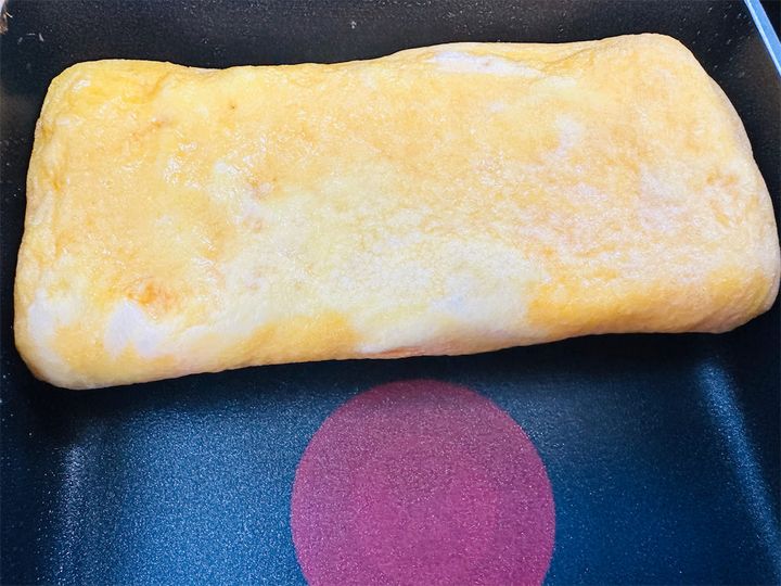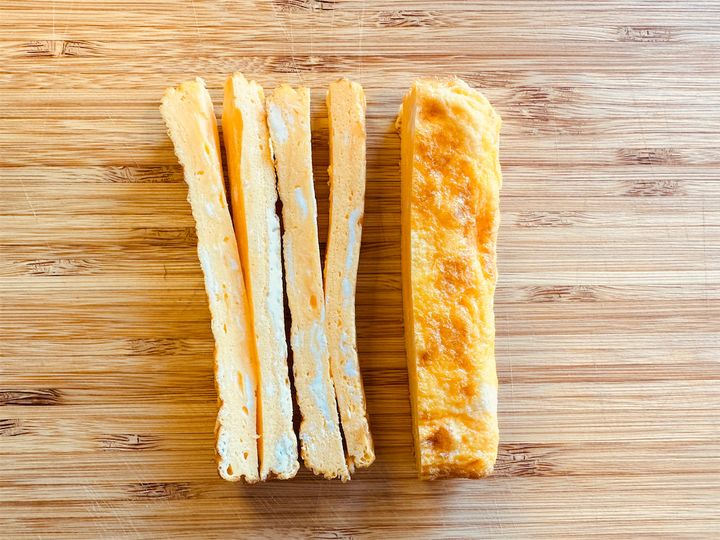 3. 卵に、砂糖大さじ 1/2 と塩一つまみ(ともに分量外)を入れて厚焼き玉子を作り、8等分に切ります。
