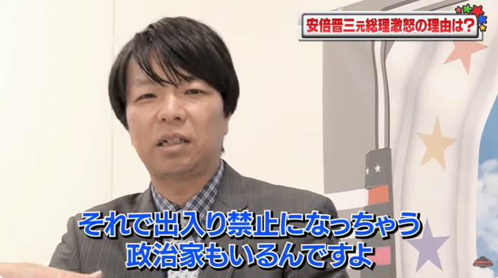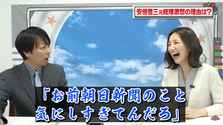 昔の話を持ち出すのは総理のやり方としてあまり良くない、と中継したところ「お前どっち向いてやってるんだ!」「怖いのか朝日新聞が!」と怒鳴られたという。青山氏はこの理由を「安倍さんには政治的な考え方がしっかりあって、そこと真逆に見えるようなことを言われたと思ったんでしょうね」「安倍さんはそこに地雷があるというのはよく分かるんですよね」と明かした。