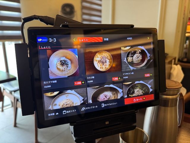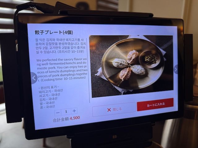お店に座ると、日本語対応の端末でオーダー。オーダーしたら事前に席でお会計というスタイルです。韓国語ができなくても注文は難しくありません。10分ほどで登場したのがエゴマ麺です! 筆者は初めてエゴマ麺を食したのですが、こちらのお店のエゴマ麺は熱い麺ではなく、ほどよい温度でした。