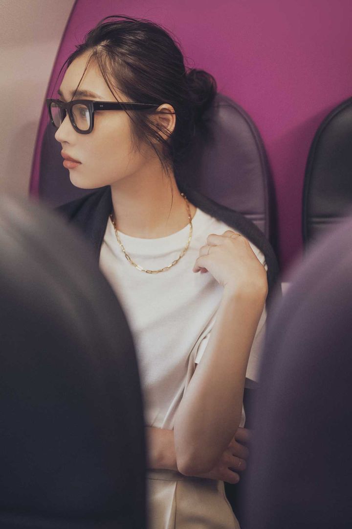 夜のフライトなどノーメークで移動するときは伊達眼鏡も必須。フレーム太めの黒ぶち眼鏡はカバーリング力が高くて便利。リップだけサッと塗ればOK。