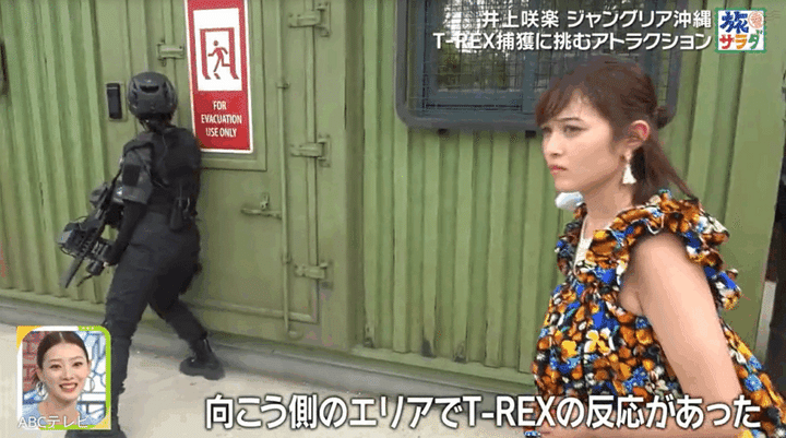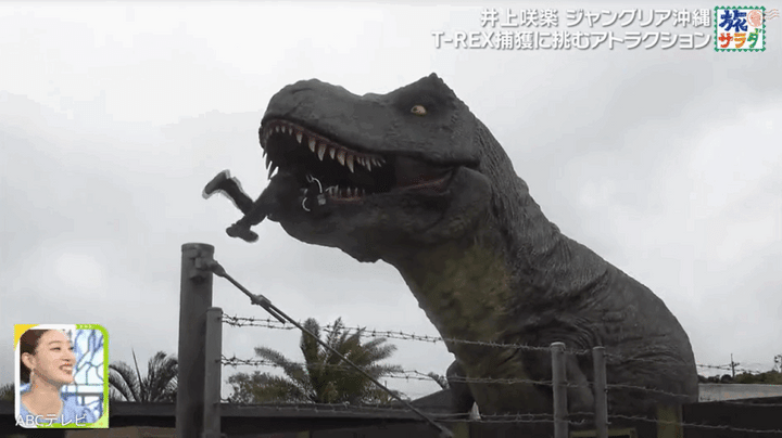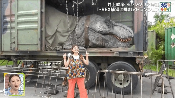 ミッションを達成した井上は、捕獲されたT-REXを背景に記念撮影。ようやく笑顔を取り戻したが、突然T-REXが大きなうなり声をあげたため、再び悲鳴を上げて大騒ぎした。