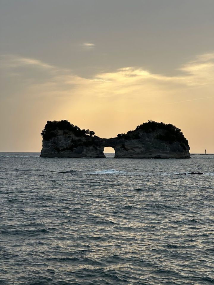 白浜のシンボル的存在「円月島」。夏場には、円月形の穴に夕陽がちょうど重なるファンタジックな瞬間を目撃できることもあるのだとか!