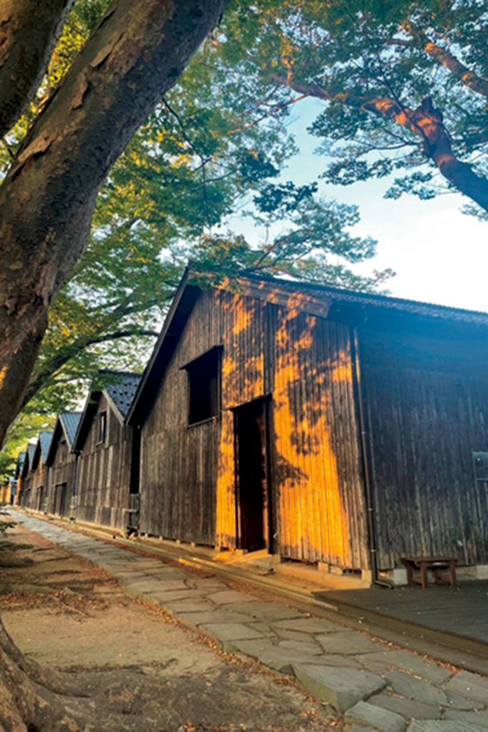 日本の伝統技術が生かされた明治初期建設の米保管倉庫。ケヤキ並木との景色は映えスポットとしても人気!