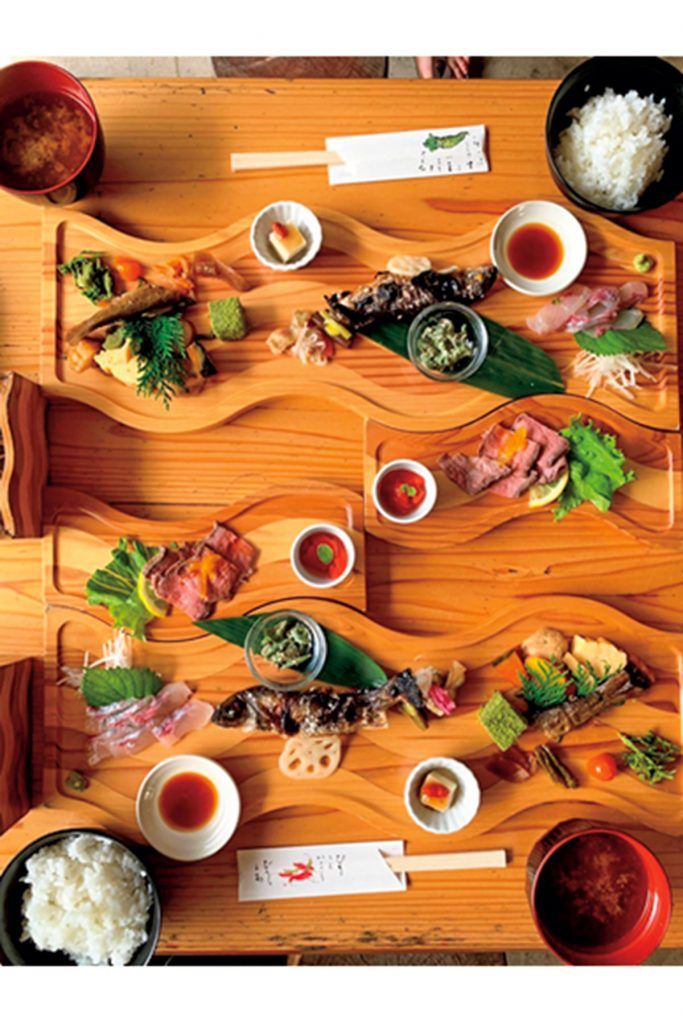 付知川に面したテラス席で川の瀬音を聞きながらの岩魚料理は味も写真映えも◎。人気の峡定食は限定30食。