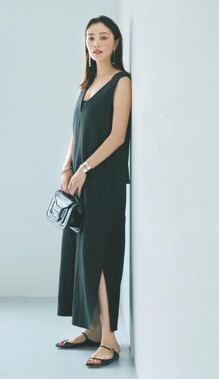 深Vネックのノースリーブワンピ。裾のスリットと合わせたざっくり感のある肌見せが大人らしく、今っぽい。ストンとしたシルエットはクールな印象をアピールできて、パンツスタイル着こなせそう。インナーで色を足して雰囲気を変えるのもgood!