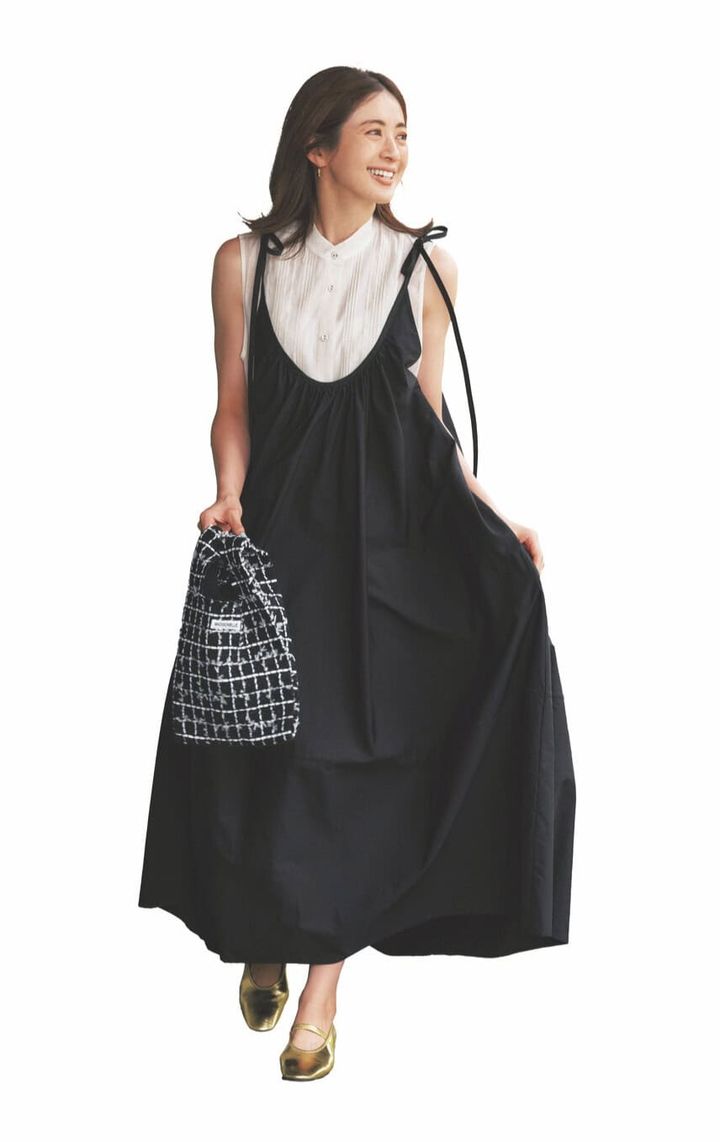 ワンピース¥38,500(ツル バイ マリコ オイカワ)ブラウス¥28,930(アストラット/アストラット 新宿店)バッグ¥126,500(J&M デヴィッドソン/J&M デヴィッドソン カスタマーセンター)パンプス¥40,700(チェンバー/クルーズ ショールーム)ピアス¥22,000(ブランイリス/ブランイリス トーキョー)バングル¥50,600(リエスタジオ/トゥモローランド)ダブルフィンガーリング¥19,360(CHIRO JEWELRY/ロードス)