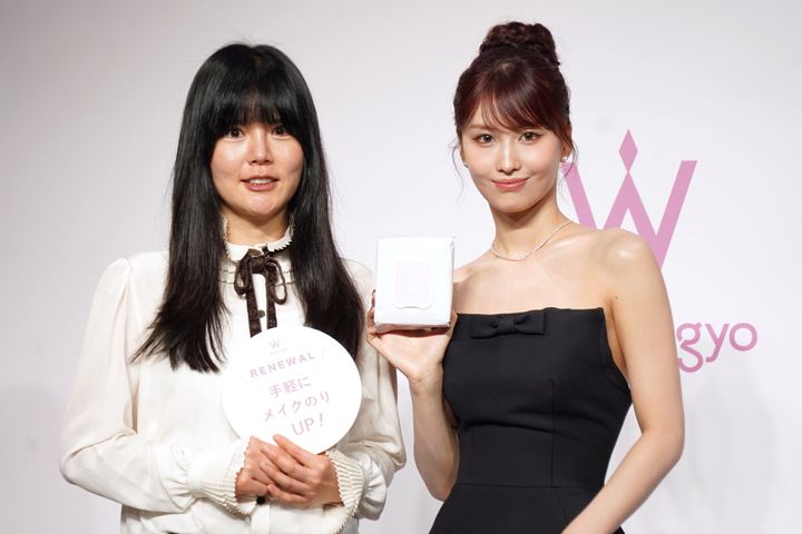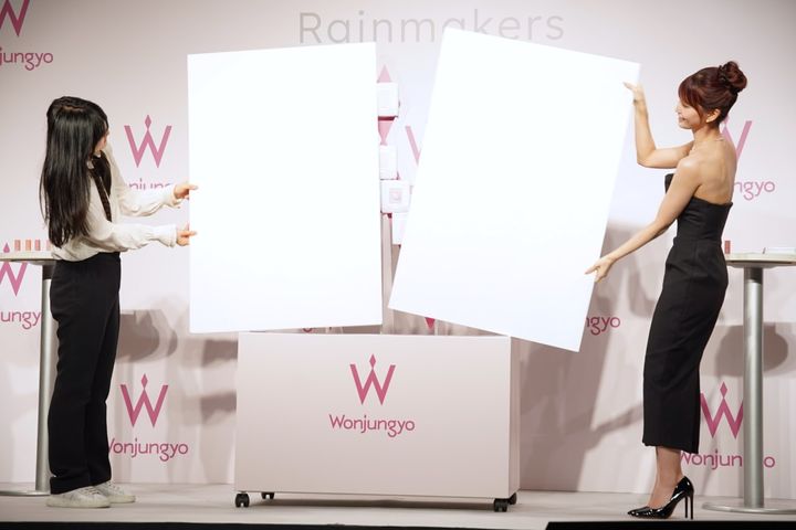 イベントでは、「モイストアップレディスキンパック」のヘビーユーザーであるMOMOさんのために、巨大スキンパックが登場! ウォン・ジョンヨ氏と二人で割くと、スキンパックでつくったWのオブジェが出てきて二人とも驚きと笑顔を見せました。