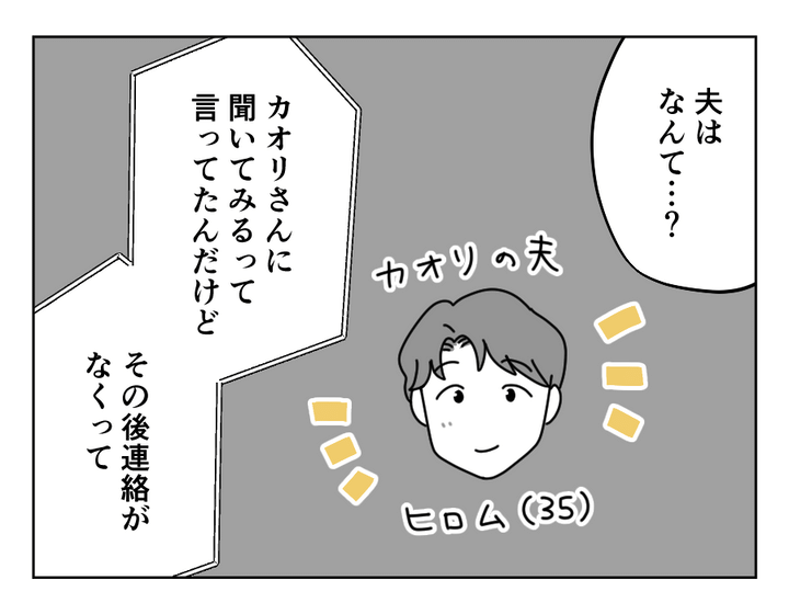 結局カオリさんもその場ですぐに返答することができず、ひとまず「一度考えさせてください」と伝え、一旦保留となりました。それにしてもヒロムさん……援助の話を放置したままなんて、ちょっと無責任ではないでしょうか? この話に対してすぐに答えが出せないということは、おそらくヒロムさんに「喜んで出す!!」という気持ちはなく、このままうやむやにしてあわよくば逃げようと思っていたのかもしれません。まずはヒロムさんに聞いてみる必要がありそうです。