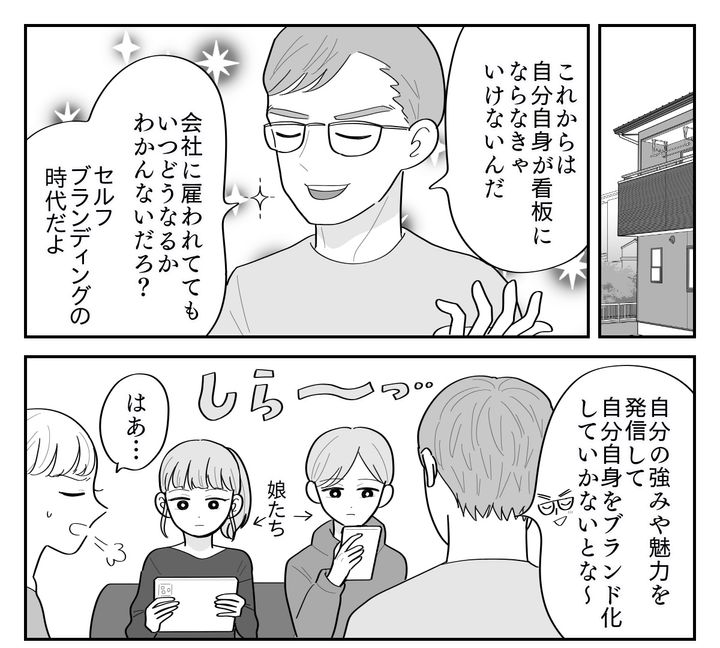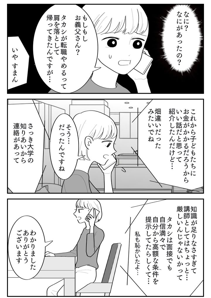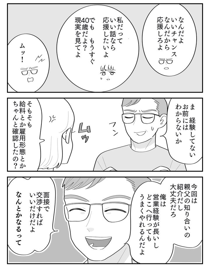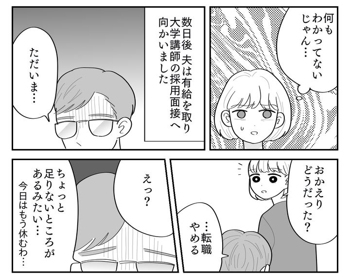 夫は大学講師の話に浮かれているようで、「セルフブランディングが重要」「自分自身を発信しなきゃ」などと持論を語ってきます。これまで転職には必ず成功してきたため、今度も絶対にうまくいくと信じて疑っていない様子でしたが……?