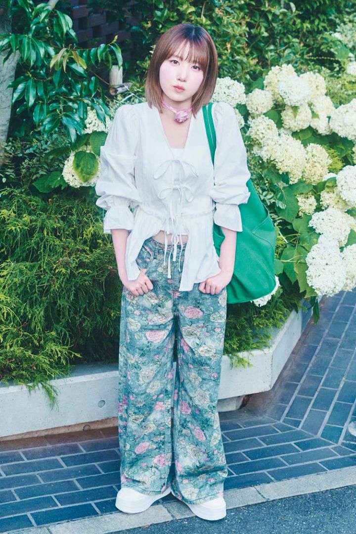 レースアップブラウス 1,903円、フラワープリントデニムパンツ 3,022円/ともにDazy(SHEIN JAPAN)チョーカー 178円、バッグ 832円、スニーカー 2,729円/以上SHEIN JAPAN