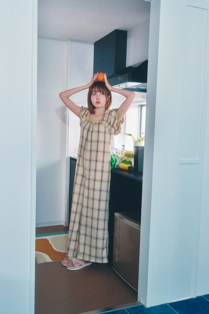 キュートなパフスリーブ、やわらかい印象のベージュチェック、女みアップのスクエアネック。