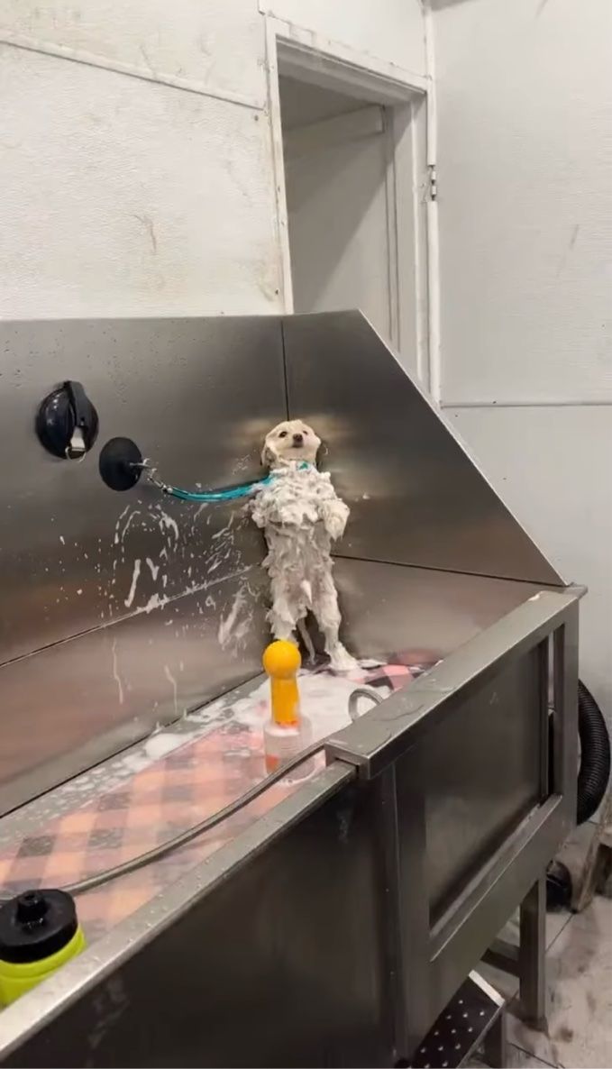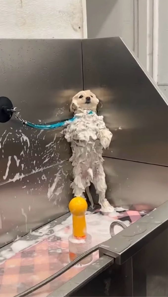 ペットサロンで撮影されたこちらの映像。 バスタブ内でシャンプーをしてもらう小型犬の姿がありましたが・・・、どうも様子が変なのです。