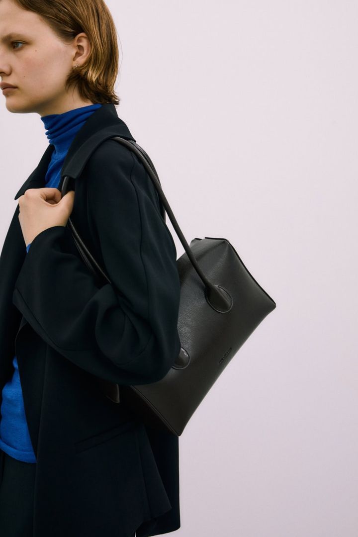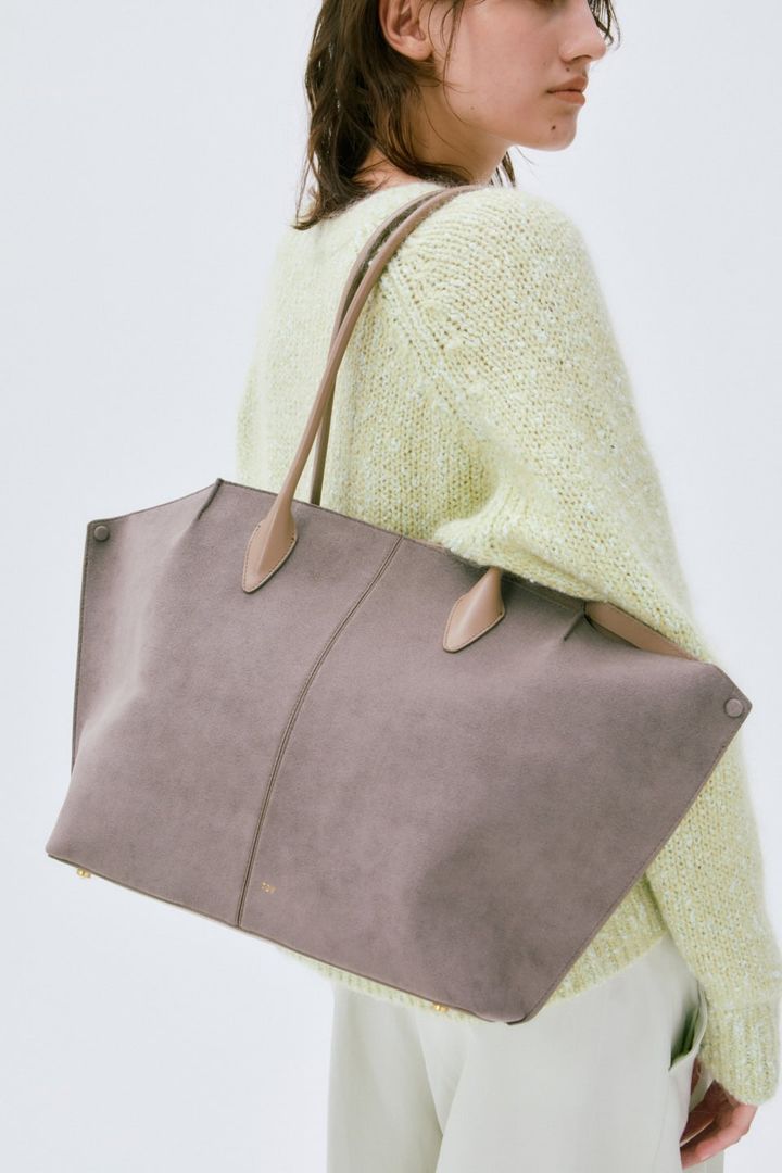 しかもPAON GRAND SUEDEは13インチのPCやA4サイズの書類も収納できるサイズ感なので、通勤には最適の大きさ。ハンドル部分が長めなので、ジャケットやコートを着たときでも肩掛け可能なのも嬉しいポイント。写真のようにアーチ型のトートバッグとしても、内側のベルトをアジャストしてコンパクトなバッグとしても使える2WAY仕様になっているので、その日の荷物量によってフォルムを変えても。