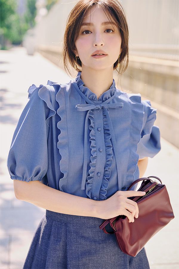 フロントに袖、スタンドネックにまで贅沢にあしらったフリルがグッドレディなブルーブラウス。首元のプチリボンが可愛らしいアクセントに。