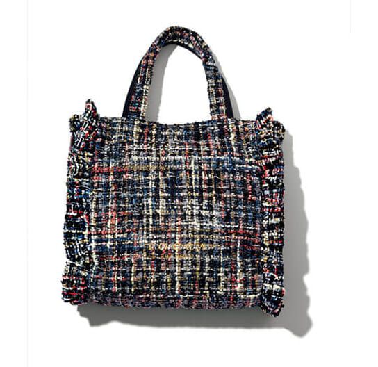 カラフルツイードは、服の色を拾いやすく使い勝手◎。サイドのフリルもポイントに。