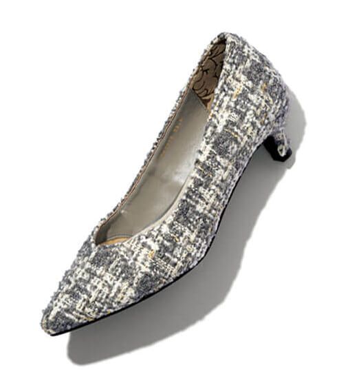 オールホワイトと色リンクさせやすい、白糸を混紡したツイード地はオススメ。低ヒールながら、シャープなポインテッドトゥで大人なムードに。