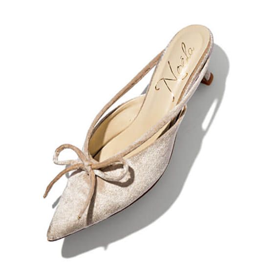 ベロア地の光沢で、白みがかったようにも映る淡いベージュカラー。オールホワイトの足元に添えれば、ワントーン風にするりとなじみます。
