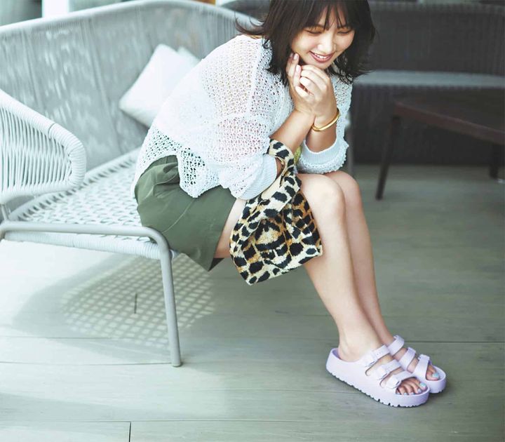 サンダル〈ソール高3.5㎝〉¥8,800(ビルケンシュトック/ ビルケンシュトック・ジャパン カスタマーサービス)ニット¥16,500(マイストラーダ)ホルターネックブラタンクト ップ¥2,290(ユニクロ)バッグ¥30,800(キリム・アーツ/H.P.FRANCE)バングル¥8,800(ワンエーアールバイウノアエレ/ウノアエレ ジャパン)