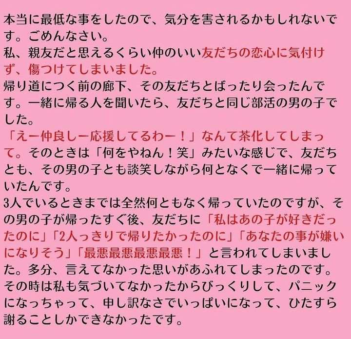 にねんせいさんの場合は、まず親友の恋心を察知し、そこに踏み入らないよう振る舞うべきだったでしょう。