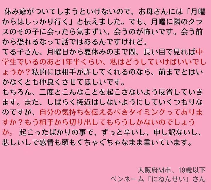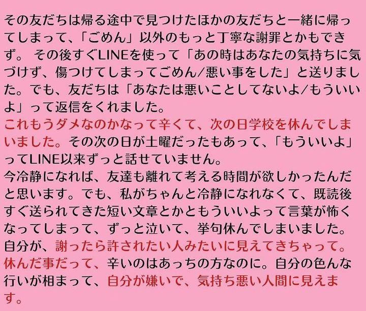 そして、その学校生活の中で、今回親友に対しておかしてしまった過失を「どうやって自分で尻ぬぐいするか」「どうやったら尻ぬぐいしたことになるのか」を考え続け、なんなら行動に起こしてみてほしいんです(先ほどの「仲直りの仕方」コラムは、行動を起こす際のひとつの参考になるであろうと思い、紹介しています)。