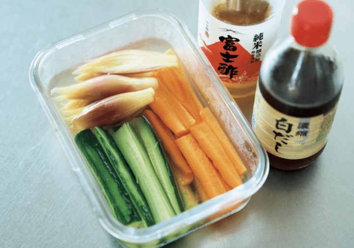 傷みやすい野菜は酢漬けに。みょうがはさっとゆで、きゅうりとにんじんは生で、すし酢と白だしを1:1 で混ぜた液に漬け、タッパーウェアのガラス製密閉容器へ。