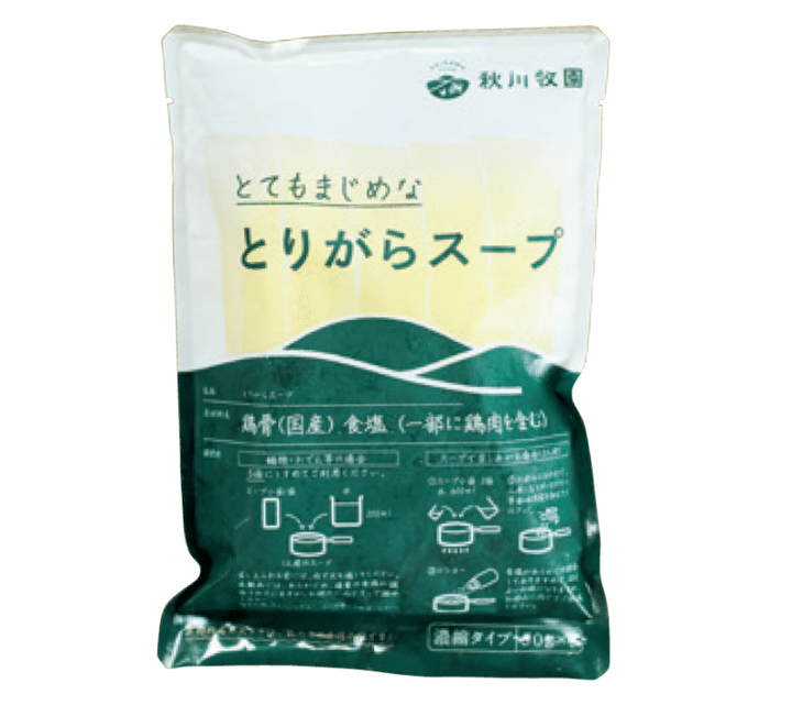 粉末の鶏ガラスープは、添加物や塩分が気になるので、秋川牧園の冷凍スープをストック。野菜と煮込むだけで簡単スープの完成。