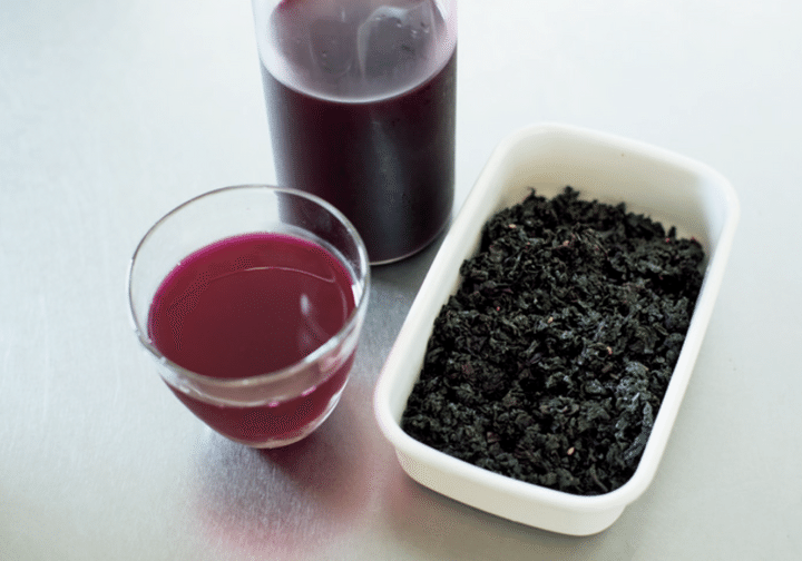 夏に何度も手作りする紫蘇ジュース。ホーロー容器に入ったふりかけは、ジュースを作った後の赤紫蘇を絞ってみじん切りにし、砂糖としょうゆとみりんで煮つけた“ウエット”ゆかり。