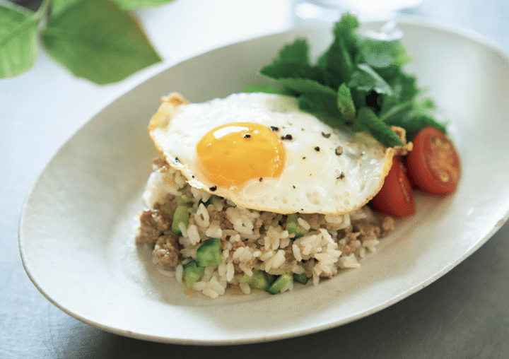豚ひき肉とみじん切りの玉ねぎを炒めて塩、オイスターソース、ナンプラー、しょうゆで調味したらボウルに移し、ごはんと細かく切ったきゅうりのピクルスと和える。器に盛り、目玉焼きをのせる。