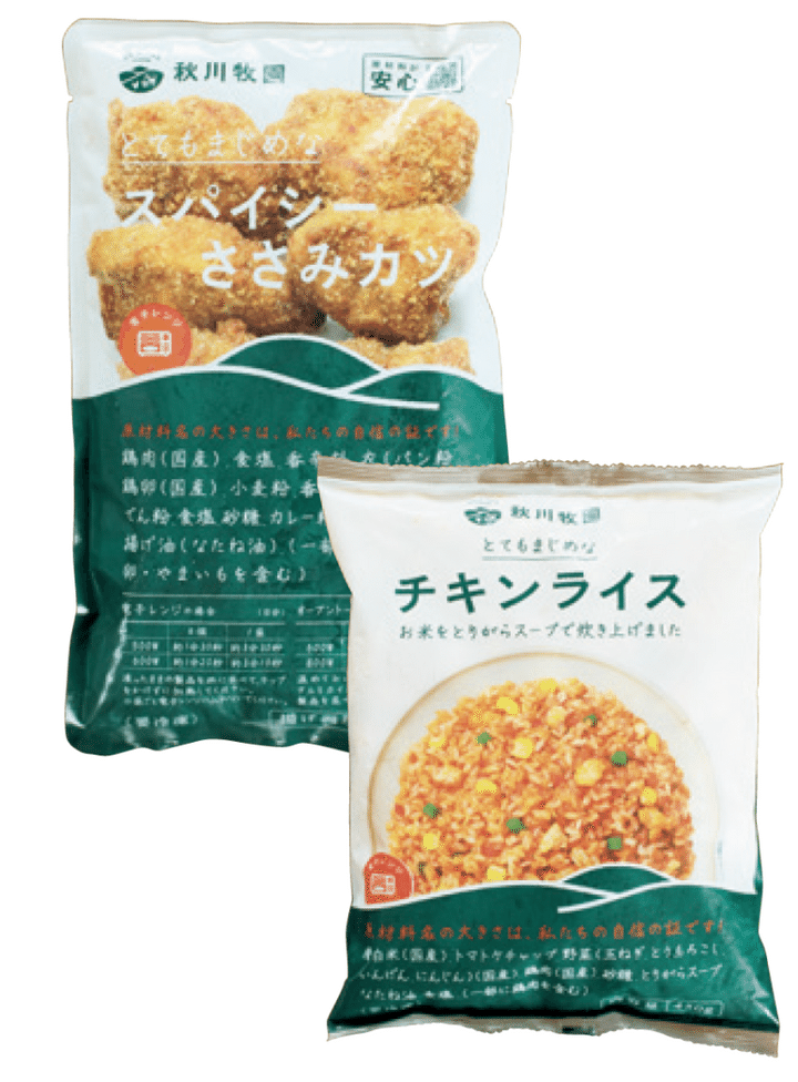 安心安全でおいしい秋川牧園の「チキンライス」「スパイシーささみカツ」。