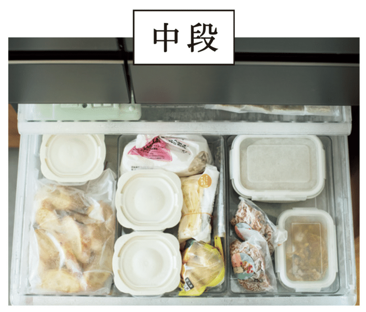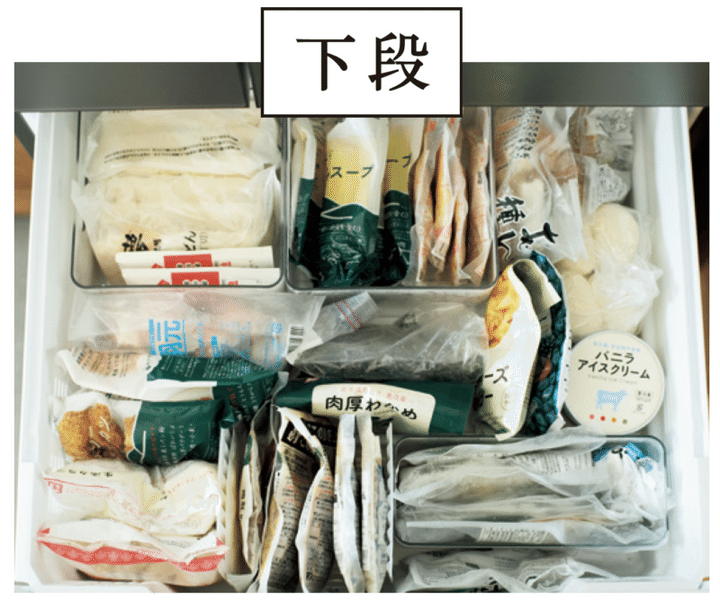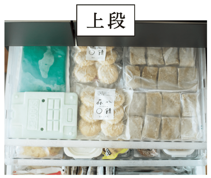 上段には家族が大好きな餅、中段には冷凍ご飯やパン、そして下段には様々な種類の冷凍食品がぎっしり。料理をする時間や体力がないときに頼れるアイテムが詰まっています。