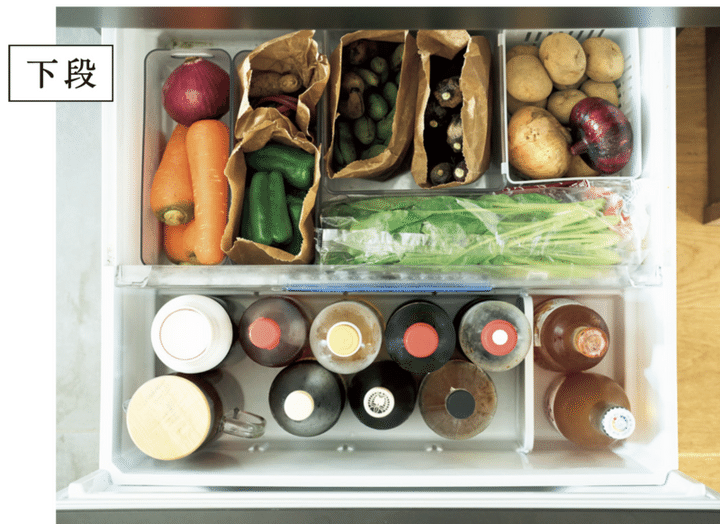 上段、下段ともにサイズを測って収納グッズを吟味しているそう。野菜はニトリの収納ケースにさらに乾燥対策で紙袋もプラス。鮮度を逃がさない工夫が随所に。