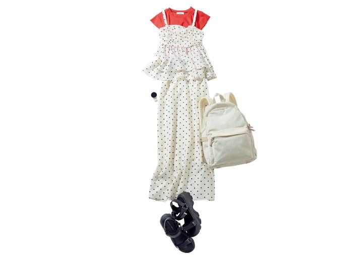デザインTシャツ¥9,900/ギャレスト(ワールド) キャミ&スカートセットアップ¥15,400/31 Sons de mode(ダブルエー) リュック¥21,450/ダイアナ(ダイアナ 銀座本店) スポーツサンダル¥8,800/オリエンタルトラフィック(ダブルエー) スマートウォッチ vivoactive 6 ¥52,800/ガーミン
