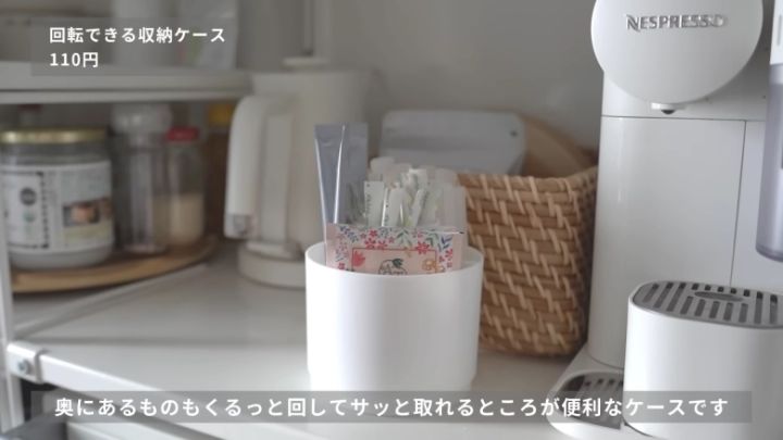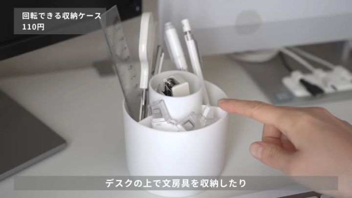 キッチンなら、食品用クリップやスティックシュガー、スティック飲料などの収納にもよさそう。底が固定されていて、収納部分がクルッと回転するので、「奥のものが取れない…」という悩みも減りそうですね!ただし、高さがない場所に置くと取り出しにくいようなので、中に入れるものや取り出す動線を考えて置き場所を決めてくださいね。