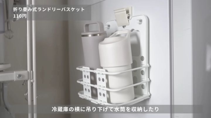 冷蔵庫に取りつけると、水筒やリサイクルする牛乳パックの収納ケースにもなります。パッと畳めるので、使わないときは邪魔になりにくいのもポイントです。