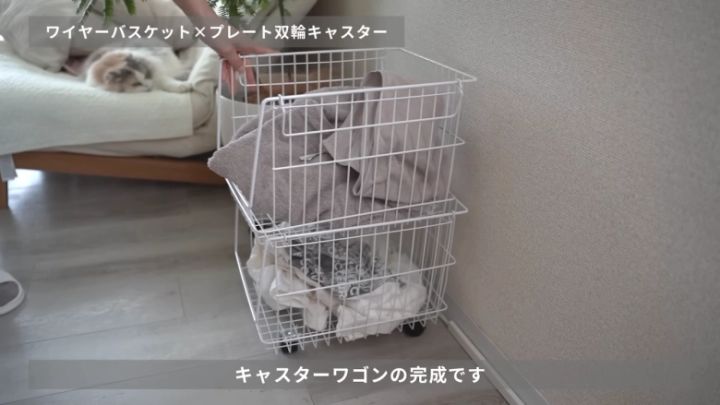 samiaさんは、先ほど紹介したワイヤーバスケットの底に結束バンドでキャスターを4個(2セット)取りつけ。バスケットの持ち手を中に倒してもうひとつバスケットを重ねると、移動式の2段キャスターワゴンの完成です。洗濯物入れとして使ったり、ペット用品や園芸グッズを収納したり、資源ごみ置き場としても活躍してくれます。