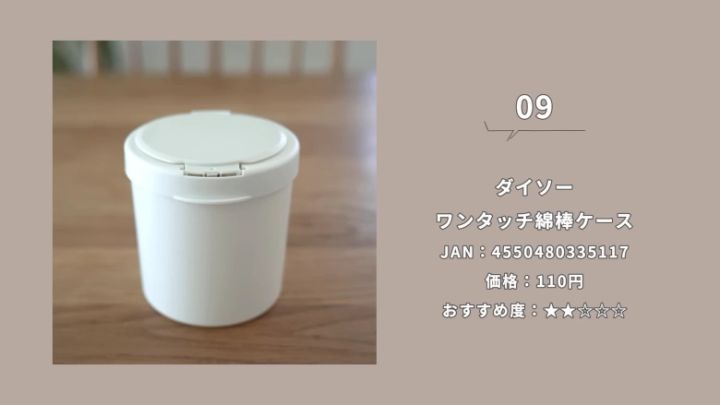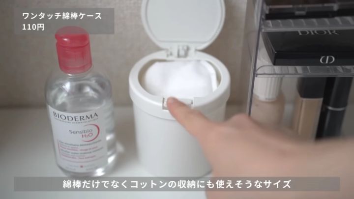 綿棒用ですが、コットンも入るサイズです。片手でひとつずつ取り出せるので、衛生面が気になるアイテムの収納にピッタリ!ふたつきなので、ちょっとしたゴミ箱として活用するのもいいでしょう。