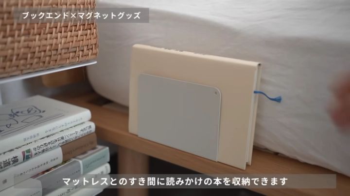 ブックエンドの長い辺をマットレスの下に差し込めば、隙間収納が完成!読みかけの本の置き場にちょうどいいということです!