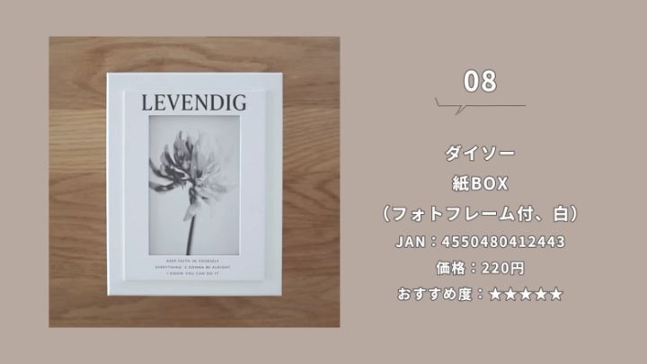 ふた部分がフィトフレーム(L判)になっており、お気に入りの写真を入れて楽しめます。元から入っている写真もおしゃれで100均とは思えないほど。そのまま収納BOXとして飾ってもお部屋になじんでくれるでしょう。