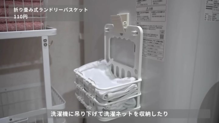 samiaさんがおすすめするのは、ダイソーのマグネットクリップでこのランドリーバスケットをはさんだ、浮かせる収納アイデア。そのまま洗濯機の側面にペタッと貼れば、洗濯用ネットなどを収納するのに役立ちます。