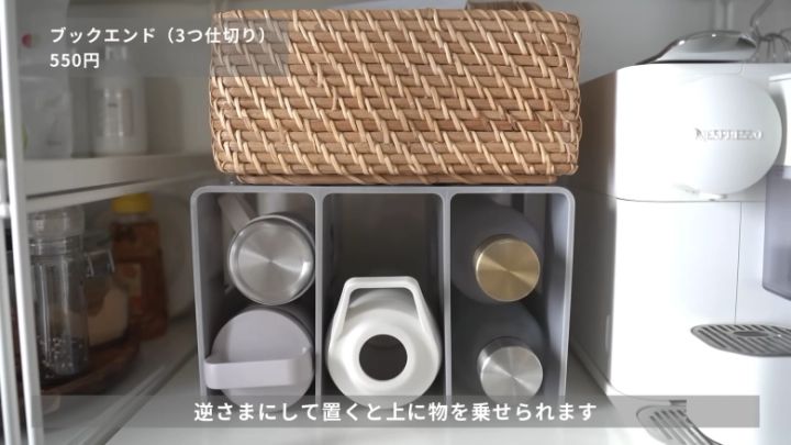 また、ブックエンドを逆さまにして、家族が多いとかさばりがちな水筒の収納にするのもおすすめ。水筒を寝かせて入れることで省スペースになり、誰のものか一目でわかりやすくなりますよ。またブックエンドの上にも物を置けるようになるので、よりスッキリした空間を目指せますね。