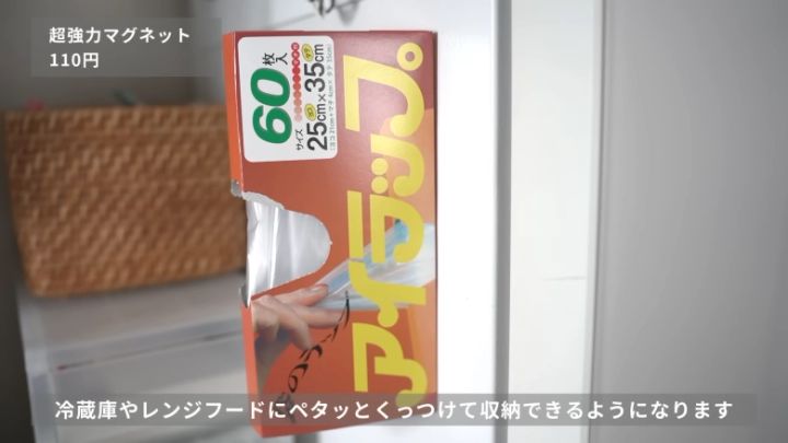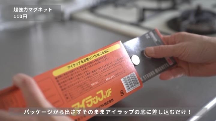 SNSで紹介されていてsamiaさんも感心したという収納アイデアは、磁石をパッケージから出さず、耐熱性のポリ袋「アイラップ」の箱の底へそのまま差し込むというもの。